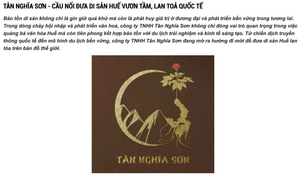 Song song với đó, Tân Nghĩa Sơn còn đẩy mạnh hoạt động quảng bá văn hóa Việt, tiêu biểu là việc kết hợp giữa bảo tồn thiên nhiên với du lịch trải nghiệm di sản Huế – thành phố được UNESCO công nhận là Di sản Văn hóa Thế giới. Thông qua những chương trình này, công ty góp phần lan tỏa giá trị văn hóa truyền thống Việt Nam đến với bạn bè quốc tế.